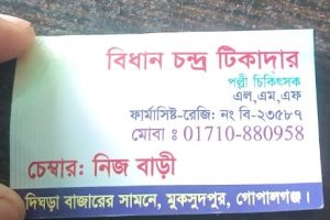 এ ব্যাপারে বিধান চন্দ্র টিকাদারের সাথ কথা বলতে চাইলে তার ছেলের মোবাইল দিয়ে ফোন করলে তিনি বলেন, আমি দুরে আছি এখন কথা বলতে পারবো না রোগি দেখতে আসছি।